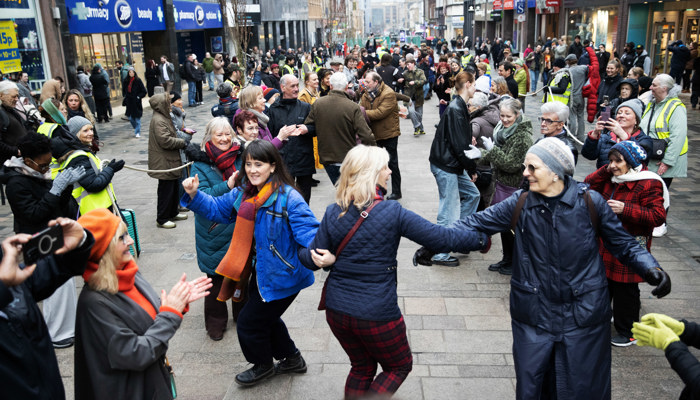 Strip the Willow - a public mass ceilidh on Sauchiehall Street celebrating the street's history of social dance and natural heritage.