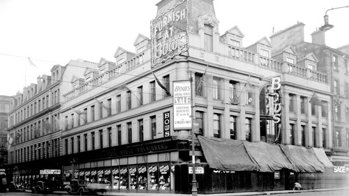 Bow’s Emporium was another well-loved department store, situated on the High Street. The business began as a hardware merchant in the 1870s by William Bow at 91 High Street. However, when larger premises further along the street were made available in 1888 by the City Improvement Trustees, Bow quickly purchased these and the ‘emporium’ was established. According to ‘Strattens’ Glasgow commercial review’ in 1891, Mr Bow ‘personally’ directed the store and its staff. Its three floors contained everything including ironmongery, rugs, brushes, glass, china, spades, bedsteads, stoves and toys! Glaswegians looking for quality furnishings headed to Bows, and the growth of imports meant that it wasn’t just home goods on offer. The Bow family were closely involved in the business until it was acquired by Robert Wylie Hill in 1947.
