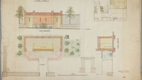 This period of building is well reflected in our series of plans of public conveniences prepared by the Glasgow Corporation Cleansing Department and which cover 1899 – 1921. The coloured plan in the image above is from the series and dates to January 1909. It is of the public urinals envisioned at the entrance to Alexandra Park which opened the following year, part of the Parks Department’s efforts to provide more amenities in the city’s public green spaces.