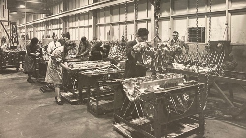 The City Archives holds a photograph album which chronicles the construction and operation of the factory as well as the training of its workforce. Within its beautifully presented pages are images like the one pictured. They capture the start of the factory’s immense contribution to the war effort. Men and women alike are glimpsed with their heads bent over engines in mid-assembly, just several of the thousands which were produced during the war.