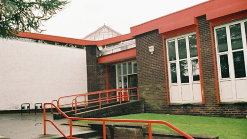 Exterior of Drumchapel Library which is a brown brick flat-roofed building with tall rectangular white windows. There is also a black and blue library sign near the entrance