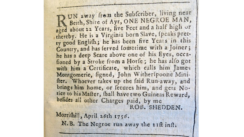 A couple of years into Jamie’s apprenticeship Robert Shedden returned. He may have been unhappy to find Jamie growing into manhood and manifesting an increasing sense of his own rights, for Shedden removed Jamie from Morrice’s workshop and set him to menial physical labour, while planning to send him back to Virginia and sell him back into plantation slavery. Jamie would later testify in court that Shedden and several other men woke him one night, tied his hands and led him along back roads to Port Glasgow in order to place him on a ship bound for Virginia. But Jamie escaped, causing Shedden to place this advertisement.